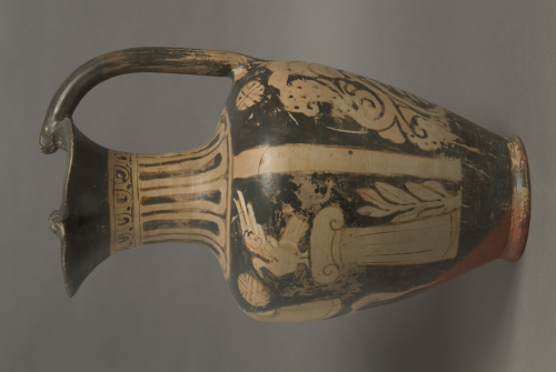 Corpo ovoidale, spalla arrotondata, collo cilindrico, bocca trilobata, piede a disco, ansa verticale a bastoncello desinente alla sommità a testa di serpente. Sul collo è decorata da un kyma ionico seguito da una finta baccellatura, sotto e ai lati dell'ansa da una doppia palmetta con girali. La scena sul lato principale del corpo è delimitata da due fasce verticali risparmiate ed è costituita da un cavaliere con chitonisco, piedi scalzi, armato di scudo rotondo e machaira, che cavalca verso sinistra un cavallo dalle forme tozze e dalla rigida criniera a trattini verticali. Dietro il cavallo è una colonnina ionica sulla quale si posa ad ali spiegate un'anatra, accanto alla colonnina è un ramoscello fogliato. Riempitivi circolari sono posti ai lati dell'ansa e tra lo scudo e l'anatra.