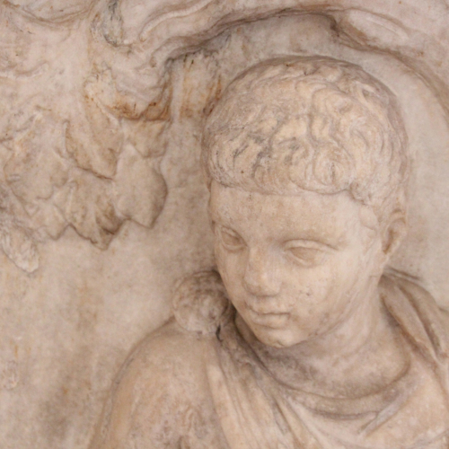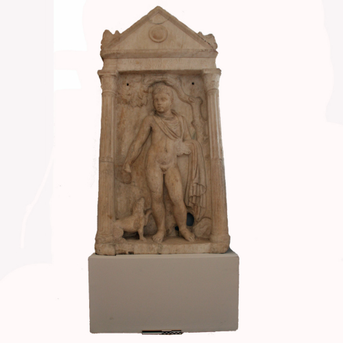 La stele appartiene ad un giovane, raffigurato mentre gioca con un cagnolino.