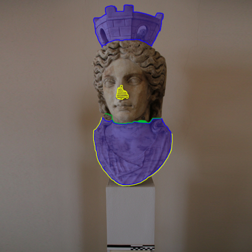 Il busto e la corona turrita sono opera di un restauro cinquecentesco; negli anni tra il 1923 e il 1926 fu tolto parte del busto.