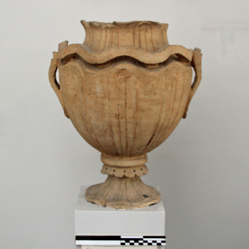 Il recipiente ha ventre ovoide, con decorazione baccellata, che ne movimenta la superficie. Ulteriore vivacità è fornita dall'elemento sinuoso che corre tutto intorno alla spalla, staccato dal resto del corpo del vaso. Il collo ha forma cilindrica, il piede è svasato.