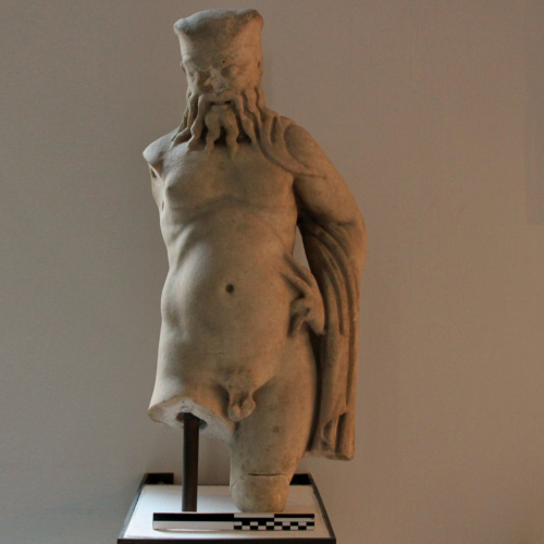 La statuetta è priva del braccio destro e di parte delle gambe. Ritrae una figura maschile, il cui viso è rivolto verso il basso. Esso ha un'espressione grottesca, accentuata da una stretta fronte, solcata da rughe profonde ed in parte coperta da una sorta di cuffia aderente. Ha soppracciglia corrugate e piccoli occhi vivaci.