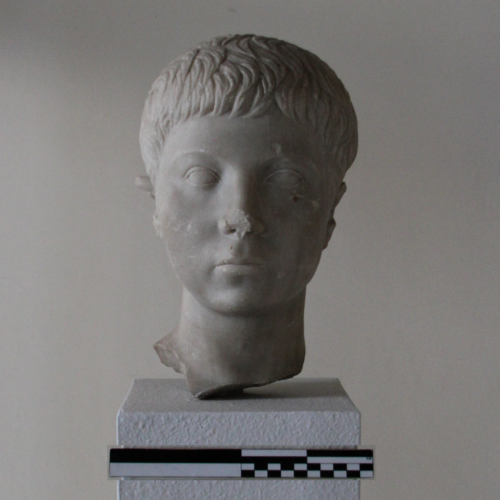 La testa, appena inclinata verso destra, possiede un viso dall'ovale allungato, in cui, si individuano una fronte stretta, arcate sopraccigliari alte e poco profonde, occhi piccoli e a mandorla. La loro forma è accentuata dalla resa realistica delle palpebre superiori e inferiori: in particolare, l'occhio sinistro risulta levemente più lungo e stretto rispetto all'altro.