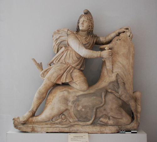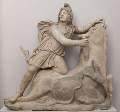 Rilievo cultuale che raffigura il dio Mithra nell'atto di uccidere il toro: il dio, con la testa rivolta all'indietro e con lo sguardo verso l'alto, vestito di tunica legata alla vita, le brache e il berretto frigi, con il mantello svolazzante alle spalle, trafigge il collo del toro con un coltello a larga lama, mentre con la mano sinistra ne solleva il muso verso l'alto e con il ginocchio sinistro lo preme a terra, tenendo ferma la zampa posteriore con la gamba destra. Sul corpo del toro, la cui coda termina con spighe di grano, sono raffigurati lo scorpione mentre stringe con le chele i testicoli dell'animale, il serpente e il cane intenti a bere le gocce della ferita.