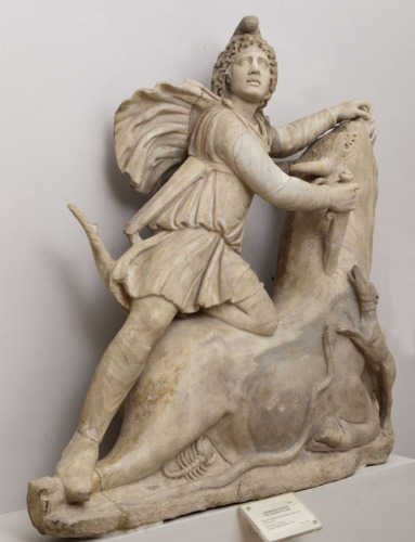 Il rilievo è da considerarsi opera di una bottega romana, come indicano il tipo di marmo lunense e la provenienza cinquecentesca del pezzo, educata nella tradizione classico-ellenistica del periodo tardoantoniniano-severiano. Esso rientra nella tipologia indicata da Leroy Campbell (Type I) e può essere confrontato con altri esempi marmorei di provenienza romana che sembrano ispirarsi a uno stesso modello o cartone di bottega, di cui due sono conservati, rispettivamente, presso il Virginia Museum of Fine Arts di Richmond e lArt Museum dellUniversità di Princeton; a questi si aggiungono anche i tre rilievi conservati a Roma, presso il Museo di Conservatori, Villa Doria Pamphilj e il Museo Torlonia.