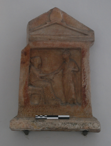 Alla medesima datazione rinviano anche alcuni particolari stilistici, come per esempio le proporzioni massicce delle figure, l'accentuazione del volume della testa e l'esecuzione frettolosa del panneggio. Tra il II e il I sec. a.C., in area greco-orientale, si assiste a una produzione di stele mediocre e corsiva, rispetto alla quale tuttavia il rilievo in esame denota una certa accuratezza nella resa dei particolari. Un confronto molto vicino sia per lo stile che per l'atteggiamento e il panneggio delle figure, è una stele con dexiosis conservata al Museo di Myconos.