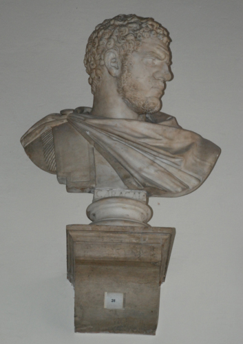 Ritratto dell'imperatore Caracalla "all'antica", raffigurato con la testa di profilo e con una accentuata torsione del collo; i tratti fisionomici sono fortemente realistici, con la fronte corrugata e lo sguardo volitivo, per evidenziare la tensione psichica del soggetto. L'effigiato indossa un manto fissato con una borchia sulla spalla destra (paludamentum).