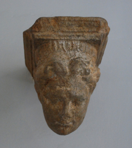 Sopra la testa, una corolla circolare decorata con ovoli alternati a foglie lanceolate, collocata immediatamente sotto la cornice; quest'ultima presenta una sequenza di elementi modanati (listello, gola rovescia, listello, cavetto). La testa fungeva probabilmente da telamone, come sostegno della cornice o della trabeazione di un edificio di piccole dimensioni che, a causa della frammentarietà del pezzo, non è identificabile.