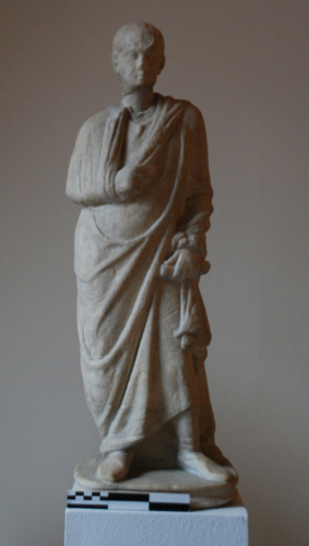 Statua ritratto di figura maschile stante su un plinto ovale modanato, gravitante col peso sulla gamba destra, mentre flette leggermente in avanti quella sinistra. Indossa una tunica, con le pieghe del panneggio trattate sobriamente, e un un mantello (hymation), che scende dalla spalla destra e, salendo verso quella sinistra, forma un'ampia piega sinuosa, in cui appoggia l'avambraccio destro. Il braccio sinistro è disteso lungo il fianco e la mano, appoggiata alla coscia, stringe un rotolo. La testa è coperta da pochi capelli di scarso volume e il volto è trattato in modo realistico, con la pelle raggrinzita e con rughe profonde, segni evidenti dell'età; ha lo sguardo rivolto in alto e verso sinistra, cui si accompagna anche una lieve torsione del collo.
