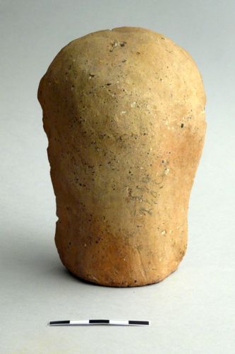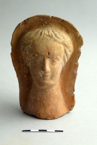 testa velata femminile (?), con capelli spartiti nel mezzo e raccolti sulla nuca; i tratti del volto sono appena abbozzati. Un velo scende dal capo lungo il collo, facendo da cornice al volto. Il collo è grosso e a tronco di cono
