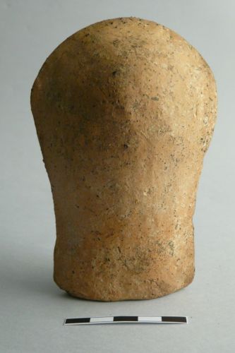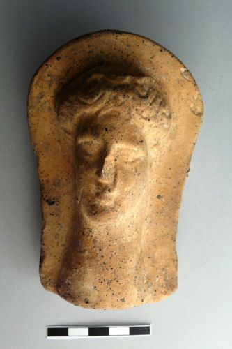 testa femminile velata, cava, con retro liscio. I tratti del volto sono poco curati e gli occhi sono solo le due cavità orbitali; i capelli sono una massa di ciocche partite sulla sommità della testa e raccolte probabilmente sulla nuca. Un velo copre la testa e scende sulle spale facendo da cornice al volto. Il collo è grosso e reso a tronco di cono