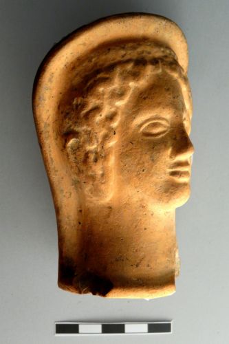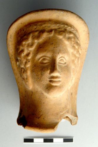 testa femminile velata, cava, con retro liscio. I tratti del volto sono curati, con gli occhi ben disegnati e regolari, piccolo naso e labbra piuttosto carnose orizzontali. I capelli sono spartiti nel mezzo e petinati in ciocche regolari che incorniciano il volto; le orecchie sono piuttosto evidneti. Sul capo è poggiato un cercine; un velo copre il capo e le spalle e fa da cornice al volto
