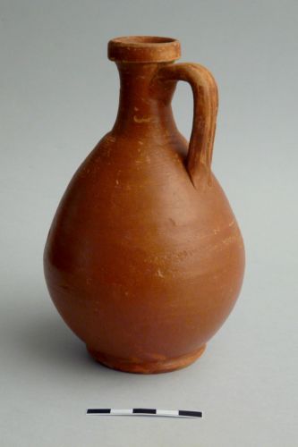 orlo a fascia (Consepctus K 17-18), collo leggermente espanso, corpo piriforme (Conspectus K b), piede ad anello, ansa nastriforme costolata impostata sotto l'orlo e sulla spalla; fondo esterno risparmiato, orlo interno verniciato