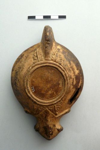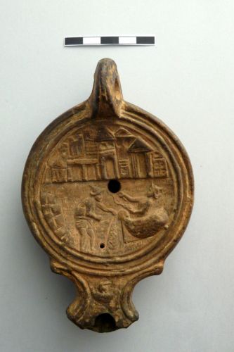 serbatoio schiacciato, spalla segnata da tre cordoli a rilievo, ansa verticale costolata; becco angolare con due volute laterali piuttosto stilizzate; disco leggermente concavo con la raffigurazione di due pescatori, uno su una roccia e uno con la rete, davanti a una città portuale. Bassissimo piede a doppio anello e doppie foglie di acanto a decorare il serbatoio sotto l'ansa e sotto il becco