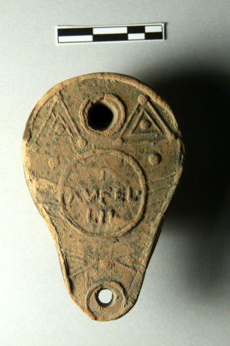sul disco piano decorazione geometrica di triangoli, punti e righe; grande foro di alimentazione decentrato e sottolineato da un doppio bordo rilevato e becco a canale completamenmte chiuso; piccolo piede a disco
