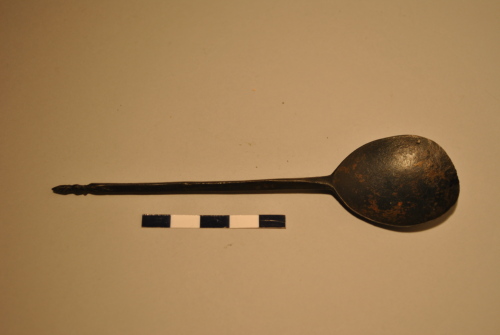 Cucchiaio con piccola conca tondeggiante. Stelo poligonale terminante a pigna.