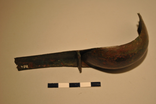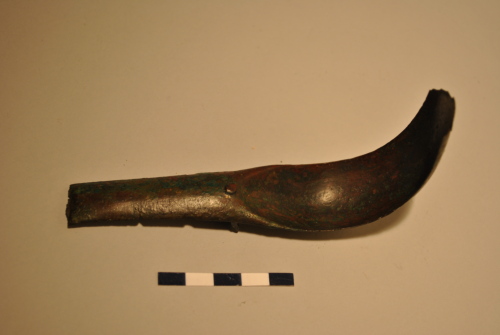 Strigile con cucchiaio molto arcuato e profondo. Impugnatura (capulus) vuota, di forma rettangolare, con perno di unione fissato con un ribattino.
