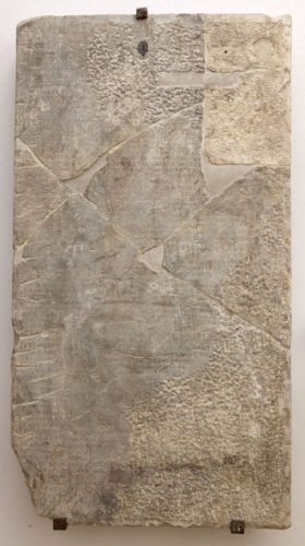 Il testo, di difficile lettura per l'eccessiva frammentarietà della pietra, è stato integrato e ricostruito grazie alla trascrizione eseguita nel 1623 a opera di Domenico Molin di una copia trasportata Venezia da Francesco Molin intorno al 1620 e successivamente perduta.