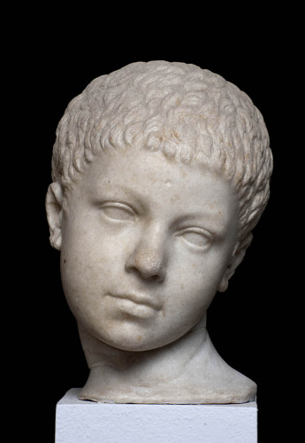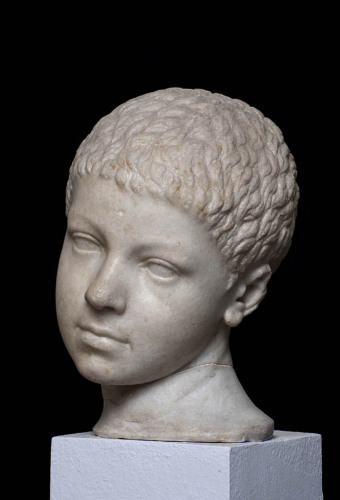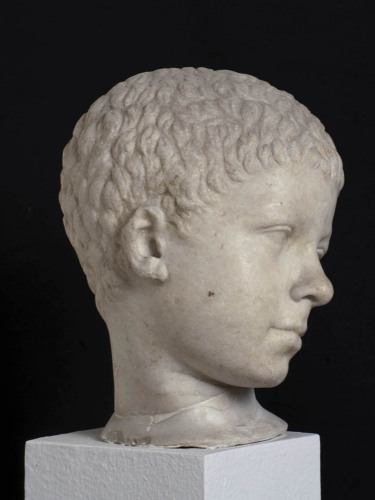 Testa di fanciullo, leggermente reclinata sulla spalla sinistra, di forma tondeggiante, caratterizzata da una fitta capigliatura, a ciocche molto corte e appiattite. Il volto, impostato su una tettonica salda mitigata dalla morbidezza del modellato, si contraddistingue per le guance morbide e paffutelle, il naso con la punta rivolta verso l'alto e a larghe narici, ma soprattutto per le arcate sopracciliari molto sfumate e le palpebre poco segnate che, arcuate superiormente e appena salienti lungo il contorno inferiore, sono lievemente flesse verso gli angoli esterni. Tutti questi particolari conferiscono alla figura un tono di pensosa malinconia, evidente nell'espressione assorta e triste dello sguardo, oramai lontano dall'osservatore e raccolto in una dimensione più intima. A suggerirlo è anche l'atteggiamento della bocca resa a labbra carnose, con gli angoli abbassati.