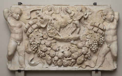 Rilievo pertinente al lato destro di un sarcofago a ghirlande, con la raffigurazione di due putti nudi, paffuti e dalle ciocche morbide, entrambi impostati secondo lo stesso schema, che li vede con la gamba interna in avanti e quella esterna scostata e lievemente flessa, mentre con il braccio destro alzato reggono il voluminoso encarpo, costituito da una teoria di grappoli d'uva, melograni, fichi, mele, pigne, corimbi, pannocchie, rosette e altri fiori e frutti meno riconoscibili. Nella lunetta formata dalla ghirlanda, sopra una base rocciosa, è raffigurato il ratto di Proserpina: a sinistra Plutone, stante sul carro e con un mantello dall'ampia velificatio, cinge con il braccio destro Proserpina, ritratta in posizione obliqua nell'atto di dibattersi. A destra, Mercurio, raffigurato di spalle, trattiene i cavalli imbizzarriti, guardando la scena con la testa volta all'indietro.