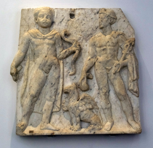Lastra con la raffigurazione, a destra, del dio Mercurio, stante sulla gamba destra e con le braccia abbassate, mentre con la mano destra regge il caduceo e con l'altra la sacca. Il capo è coperto dal petaso e un corto mantello, piegato sulla spalla sinistra ricade in grosse pieghe avvolgendo il braccio sinistro. La testa è rivolta verso la figura di sinistra che ritrae Apollo stante, in posizione frontale, con un lungo mantello fissato al petto con una fibula rotonda, mentre con la mano destra piegata verso l'interno stringe un plettro e con la sinistra, piegata verso l'alto, impugna un arco trasfigurato in serpente. Il volto presenta tratti molto caratterizzati: largo e con le guance paffute, ha il mento e il naso poco prominenti, con gli occhi dal profilo angoloso, le palpebre spesse e le pupille segnate da un foro di trapano poco largo e profondo; infine, è incorniciato da una capigliatura a ciocche movimentate, con una corta frangetta che copre la fronte. Tra le due figure un grifone accucciato, rivolto verso Apollo.