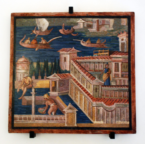 Pannello musivo a tessere colorate di medie dimensioni, che raffigura un paesaggio marino con una villa in primo piano, alcune barche in secondo piano con alcuni edifici affacciati sul mare, sullo sfondo.