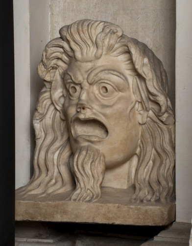 In passato era stata avanzata l'ipotesi, sulla base della forma triangolare di appoggio, che questa maschera marmorea, alla pari dell'altra, fosse stata utilizzata come acroterio o come antefissa da sarcofago; date le dimensioni, è più probabile invece che la maschera abbia costituito la parte di una decorazione architettonica.