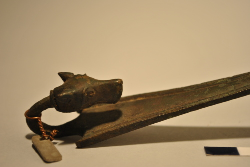 Attingitoio/simpulum con conca tondeggiante, profonda, decorata da due volute all'attacco del manico. Manico a sezione rettangolare con estremità sottolineata da due apofisi e terminante in una testa zoomorfa: cane/lupo con muso allungato, bocca chiusa, occhi con pupilla marcata, orecchie triangolari.