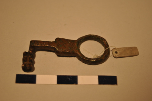 Chiave a scorrimento con anello circolare. Stelo rettangolare. Innesto a sezione rettangolare. Elemento trasversale a sei denti triangolari.