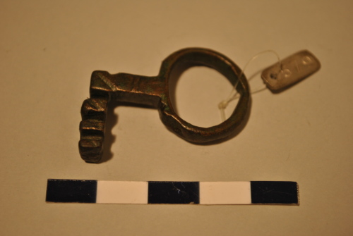 Chiave a scorrimento con grande anello circolare. Stelo rettangolare sottolineato da due scanalature. Elemento trasversale a tre denti rettangolari.