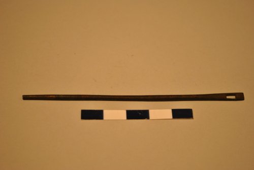 Ago con stelo circolare. Cruna appiattita di forma rettangolare con foro passante rettangolare. L'estremità appuntita è frammentata.