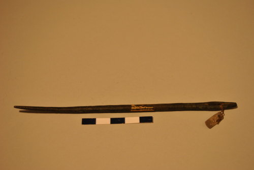 Grosso ago a sezione circolare. Cruna appiattita con foro passante ovale. Punta consunta.