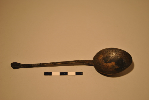 Cucchiaio con profonda conca tondeggiante. Stelo e sezione rettangolare con terminazione a paletta.