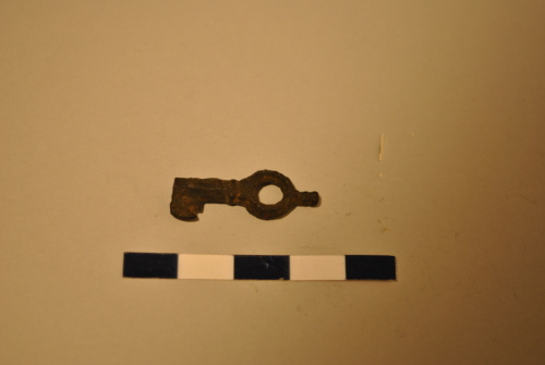 Chiave di piccole dimensioni con anello sottolineato da un piccolo bulbo. Innesto tubolare cavo. Elemento trasversale di forma rettangolare, dotato di incavo.