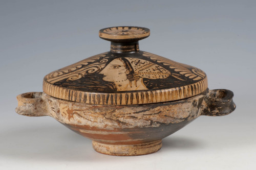 Il coperchio presenta un orlo verticale, corpo a profilo troncoconico e presa a pomello, superiormente appiattita. La superficie esterna del recipiente è decorata con un tralcio vegetale orizzontale che corre lungo tutta la superficie in corrispondenza dell'orlo mentre il coperchio è decorato con due figure femminili volte a sinistra, racchiuse entro palmette e racemi floreali stilizzati. Le due figure femminili, dipinte in bianco e rappresentate con i medesimi dettagli iconografici, sono raffigurate con una raffinata cuffia, decorata con svastiche e nastri stilizzati, e una collana resa con una sequenza di tratti puntiformi.