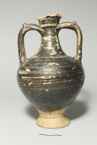 Il reperto presenta un alto piede "a ventosa" internamente umbonato, corpo a profilo ovoidale, spalla, largo collo a profilo cilindrico, orlo estroflesso marcato alla sommità da una nervatura sporgente e labbro a breve tesa orizzontale sporgente. In posizione speculare, sono presenti due anse a sezione circolare, superiormente caratterizzate dalla presenza di un nodo, che si impostano subito al di sotto dell'orlo.