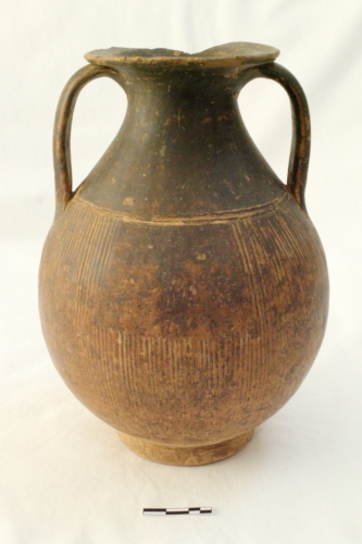 Il reperto presenta un piede a disco distinto, corpo a profilo ovoidale, spalla, largo collo a profilo troncoconico, orlo estroflesso e labbro a breve tesa orizzontale sporgente. In posizione speculare, sono presenti due anse a nastro che si impostano subito al di sotto del labbro.