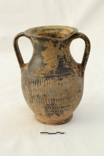 Il reperto presenta un piede a disco distinto, corpo a profilo ovoidale, spalla, largo collo a profilo cilindrico, orlo estroflesso e labbro a breve tesa orizzontale sporgente. In posizione speculare, sono presenti due anse a nastro che si impostano subito al di sotto del labbro.