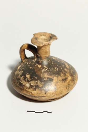 Il reperto presenta un piede a disco distinto, corpo a profilo globulare molto schiacciato, breve collo cilindrico marato da una nervatura alla base, orlo a breve tesa orizzontale pendente e labbro assottigliato. Alla base del collo si imposta una breve ansa a gomito, che presenta una sezione ellittica.