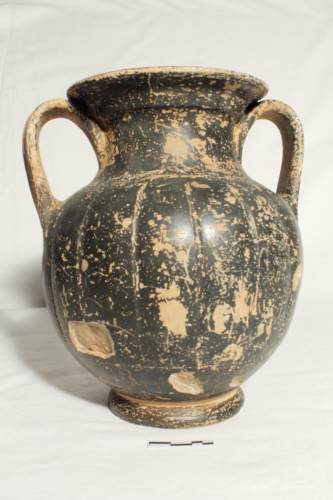 Il reperto presenta un piede ad anello, corpo a profilo ovoidale, spalla, largo collo a profilo cilindrico, orlo estroflesso marcato da una solctura rientrante e labbro a breve tesa orizzontale sporgente. In posizione speculare, sono presenti due anse a nastro che si impostano subito al di sotto del labbro.