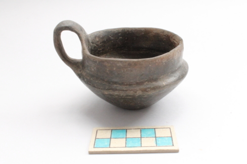 Il reperto presenta un piede a disco indistinto, corpo a profilo emisferico schiacciato, spalla, orlo verticale indistinto, labbro irregolare arrotondato e un'ansa a nastro, sormontante, che si imposta direttmente sul labbro.