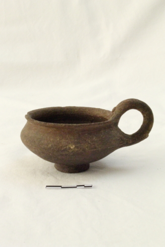 Il reperto presenta un piede ad anello, internamente leggermente umbonato, corpo a profilo ovoidale schiacciato, quasi biconico, orlo leggermente estroflesso, labbro arrotondato e una ansa a sezione circolare, sormontante, che si imposta direttamente sul labbro.