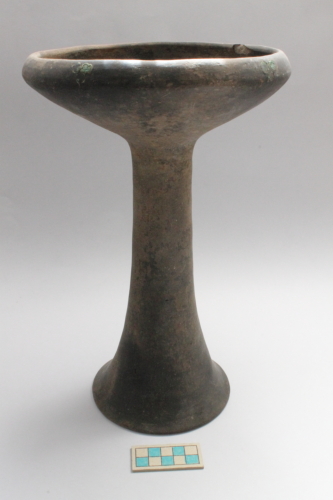 Il reperto presenta un piede "a imbuto" cavo, lungo stelo cilindrico liscio, corpo a profilo emisferico schiacciato, orlo leggermente entroflesso e labbro ingrossato e arrotondato.