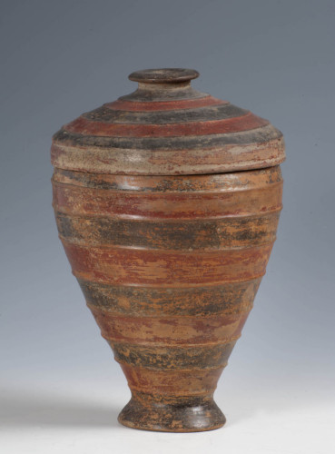 Il corpo dell'ossario e il suo coperchio presentano un decoro caratterizzato da larghe fasce orizzontali, delimitate da nervature e dipinte con sequenza alternata in rosso e nero.