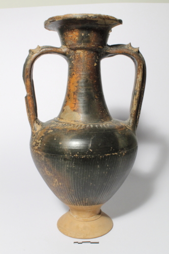 Il reperto presenta un largo piede a disco distinto, corpo a profilo ovoidale, spalla, lungo collo cilindrico, orlo leggermente obliquo marcato inferiormente da uno scalino e labbro a tesa orizzontale sporgente. In posizione speculare, sono presenti duealte anse a nastro, apicate sul gomito.