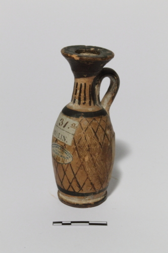 Il reperto presenta un basso piede ad anello distinto, corpo a profilo ovoidale, sottile collo cilindrico, grosso orlo "a imbuto", largo labbro appiattito superiormente e piccola ansa a sezione ellittica. Il corpo è caratterizzato da una fascia delimitata da due larghe linee orizzontali dipinte in nero, campita da un decoro "a reticolo". In corrispondenza del collo è presente una sequenza di linee verticali dipinte in nero.