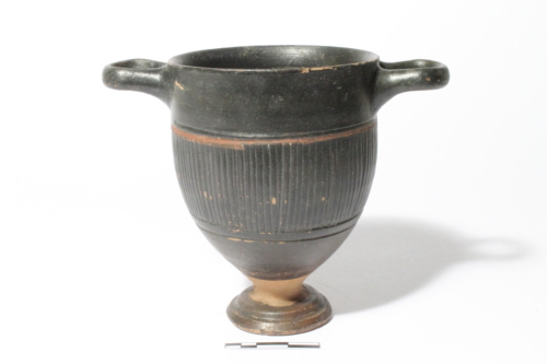 Nel corpo è presente un decoro a fitte e sottili linee verticali incise, rcchiuse entro una fascia orizzontale, superiormente marcata da una linea di colore rosso.