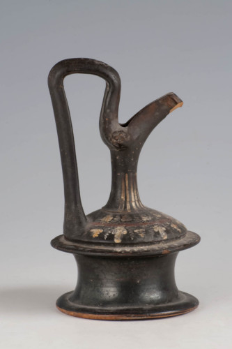 Il reperto presenta un piede a disco distinto, corpo " a rocchetto", spalla obliqua, stretto collo cilindrico, pronunciato beccuccio versatore e un'ansa a gomito sopraelevata. La spalla è caratterizzata da un decoro dipinto in bianco e rosso che rappresenta un motivo vegetale stilizzato (tralcio con inflorescenze, frutti e foglie).