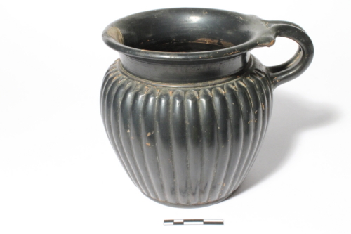 Il reperto presenta un piede a disco indistinto, corpo a profilo ovoidale, spalla, largo e breve collo cilindrico, orlo estroflesso, labbro arrotondato e ansa a nastro insellata che si impista direttamente sul labbro. Il corpo è caratterizzato da una sequenza di larghe nervature verticali.