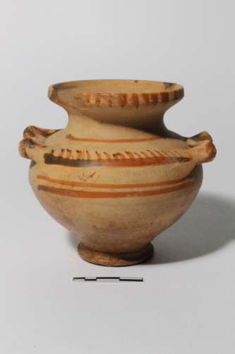 Nel corpo e nel collo sono presenti sottili linee orizzontali dipinte in rosso mentre nella spalla compare una linea dipinta in rosso, superiormente marcata da una sequenza di trattini obliqui. Piccoli tratti verticali dipinti in rosso marcano esternamente anche il labbro.