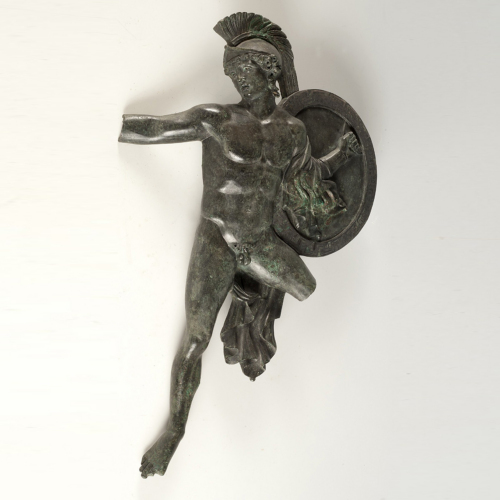 La mano sinistra stringe con forza lo scudo, di forma circolare, mentre una morbida clamide fortemente scossa dal movimento veloce e convulso, si avvolge attorno al braccio e ricade tra le gambe.